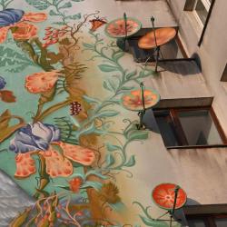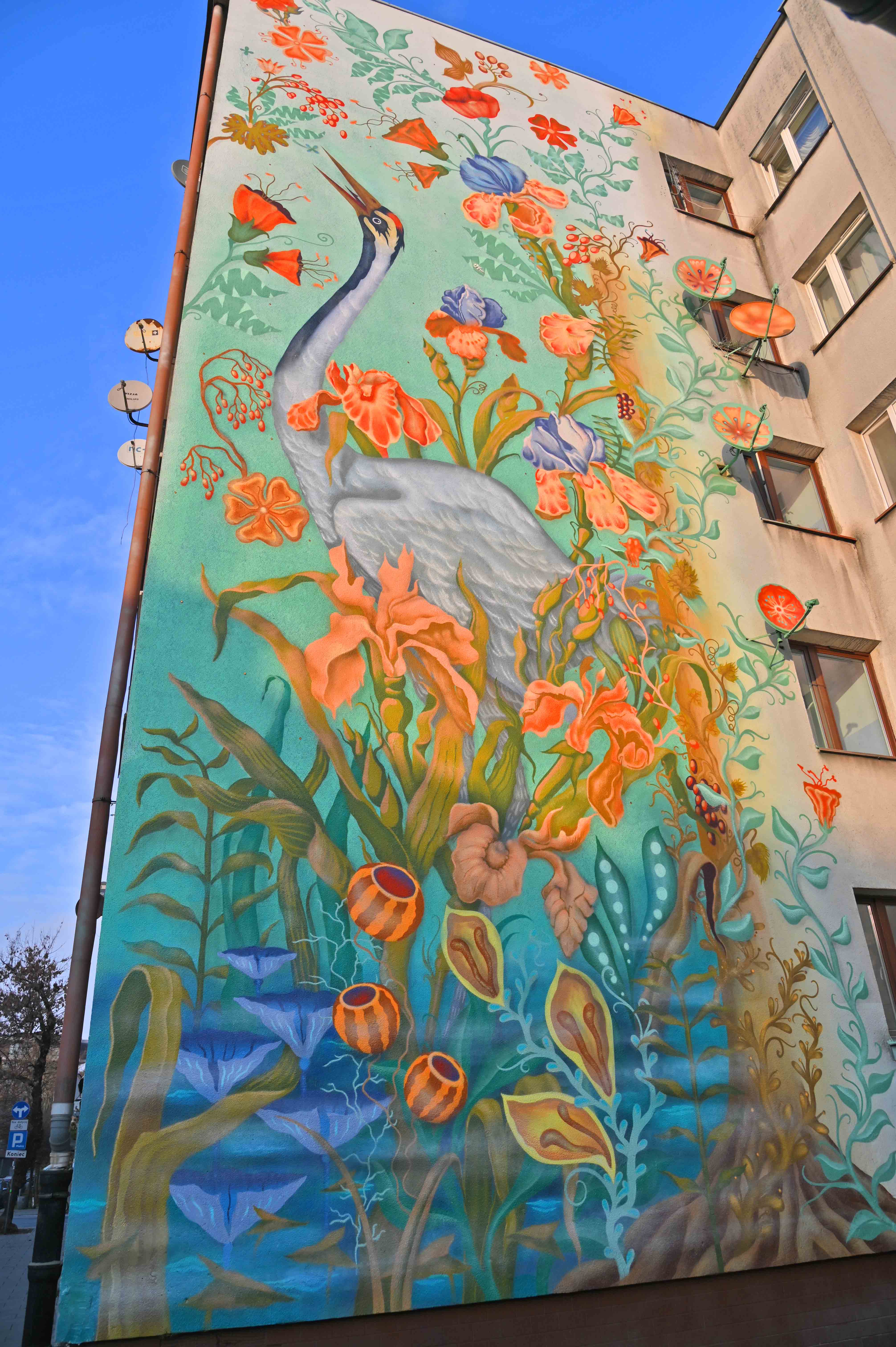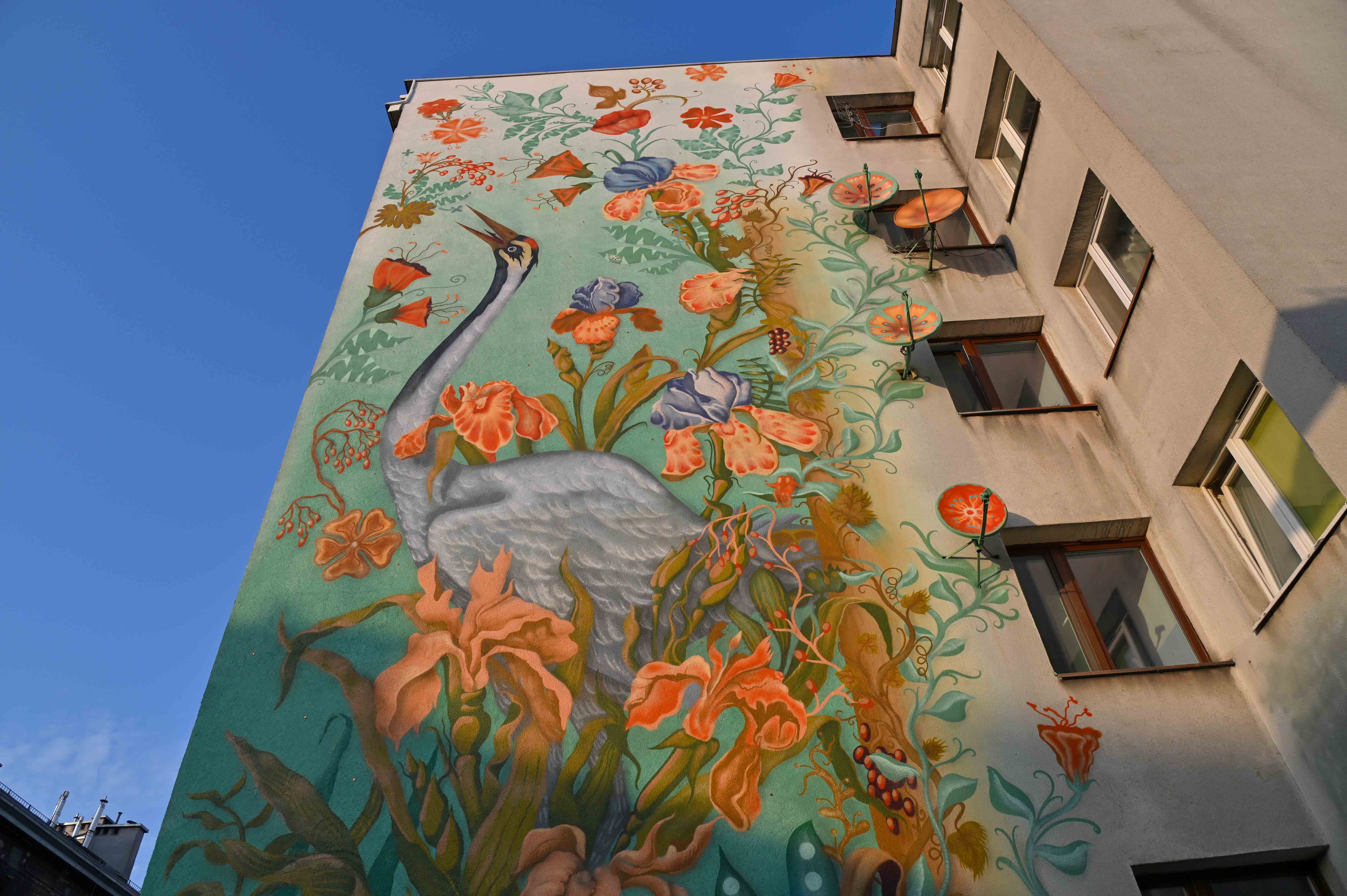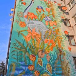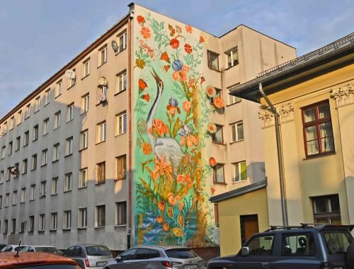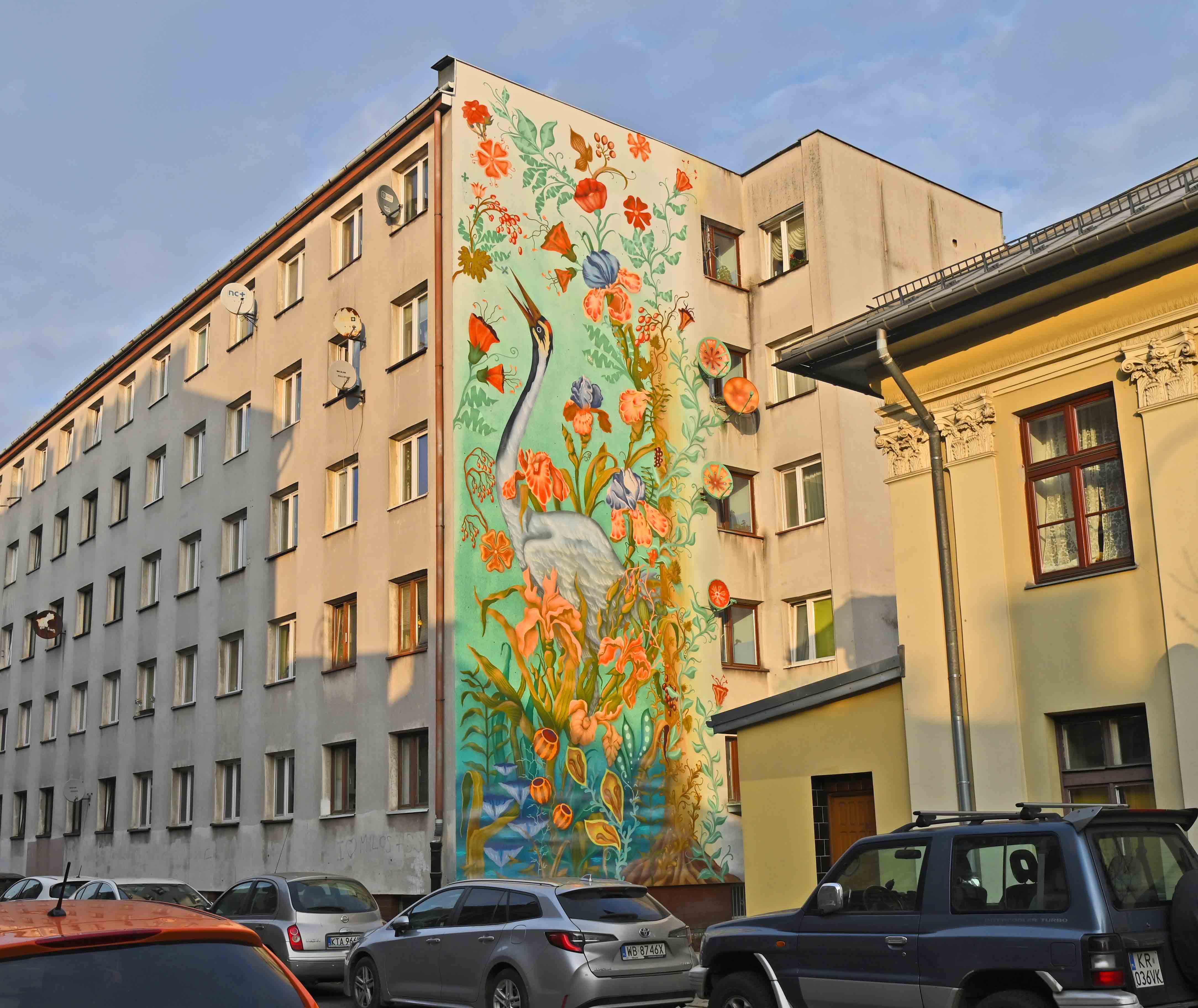Mural Łąka, który znajduje się na elewacji podgórskiego bloku, nawiązuje do zwierzęco - roślinnych motywów na arrasach wawelskich. Na królewskich tapiseriach znajdują się też żurawie. Motywy roślinne to nawiązanie do kwietnych fresków Stanisława Wyspiańskiego w kościele franciszkanów.