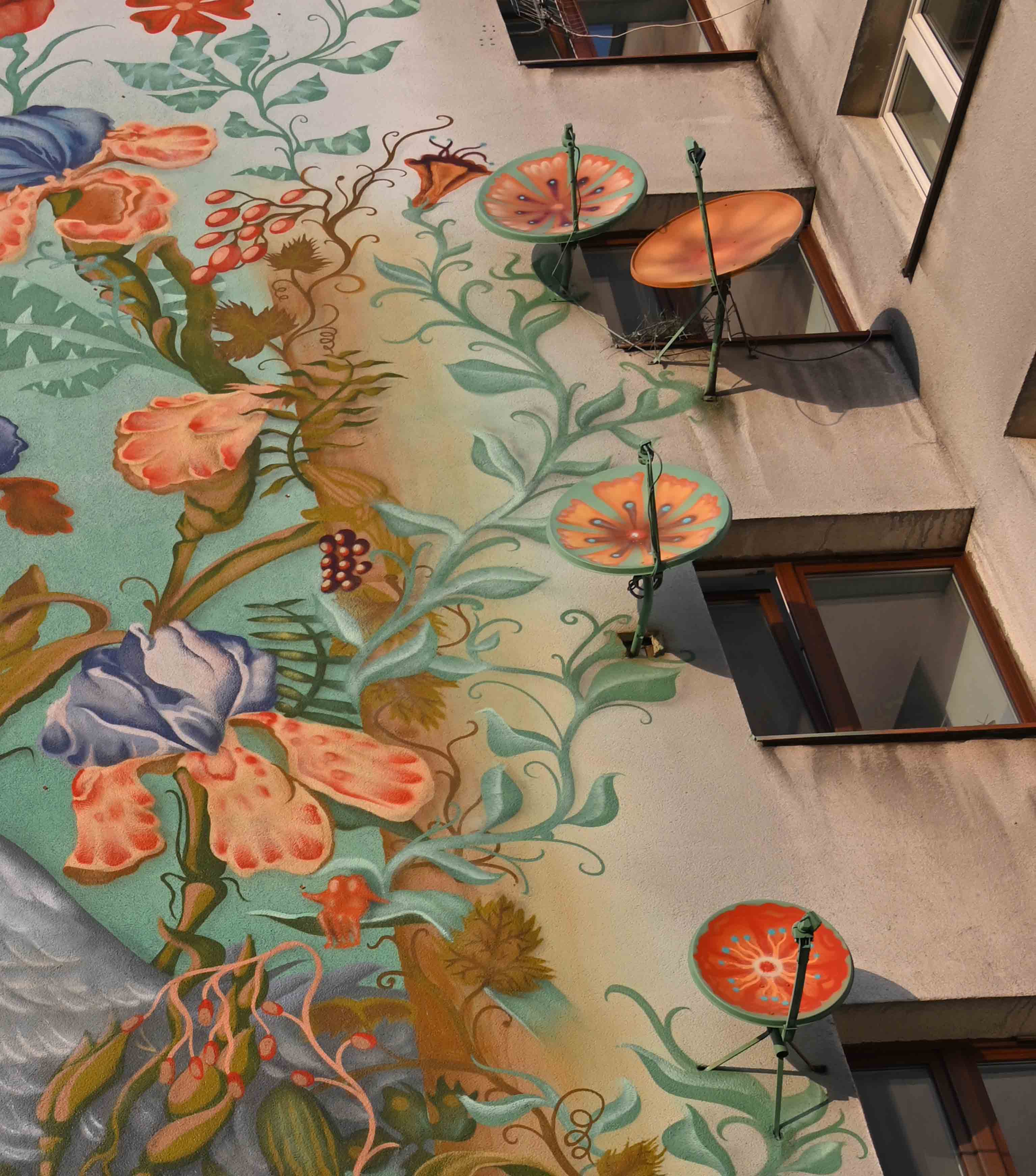 Świetnie wyglądają talerze anten satelitarnych jako kwiaty.